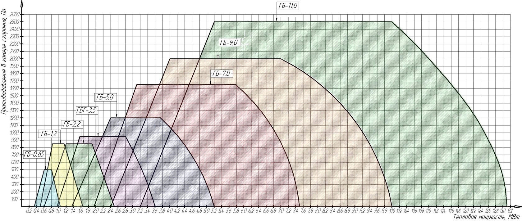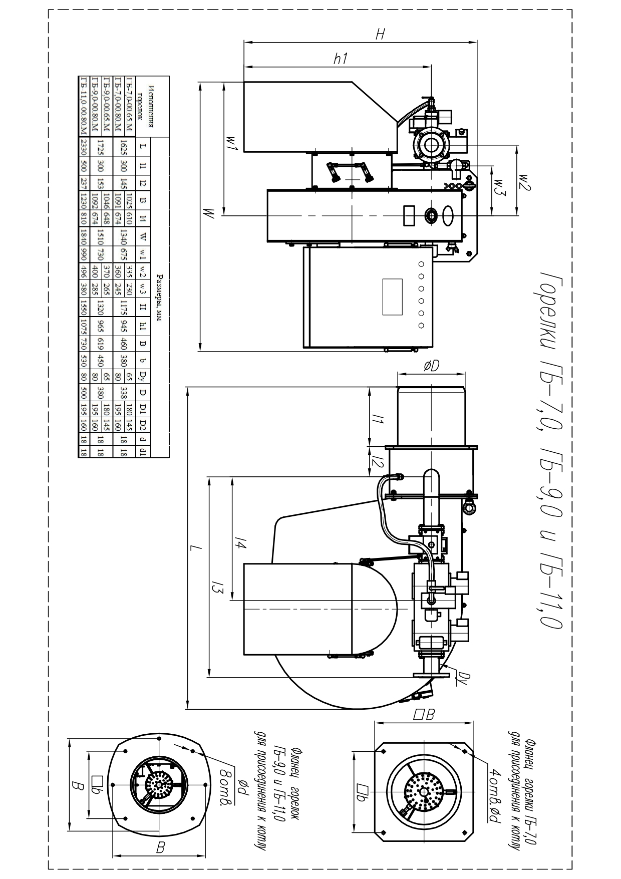Габаритные и присоединительные размеры горелок ГБ-7,0; ГБ-9,0;ГБ-11,0