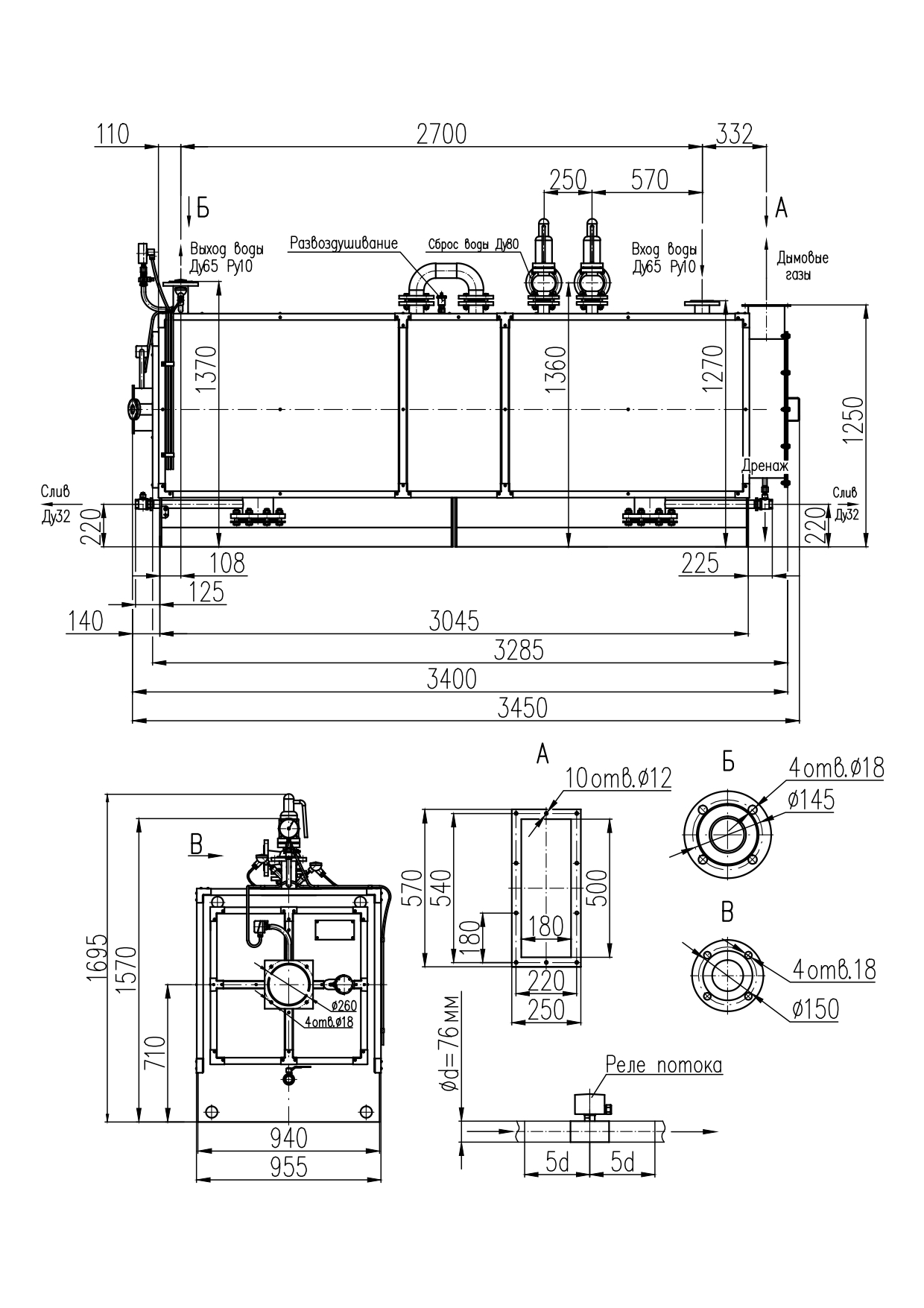 Габаритные и присоединительные размеры котла КВ-0,75