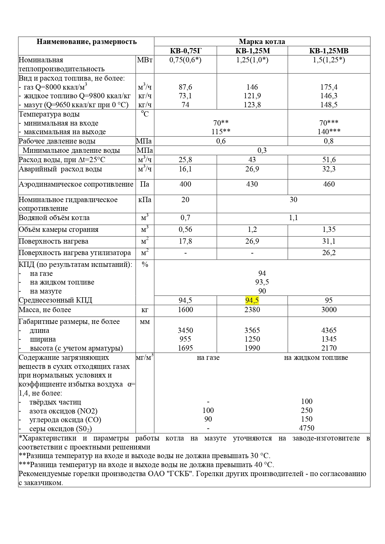 Технические характеристики КВ-0,75; КВ-1,25; КВ-1,25МВ