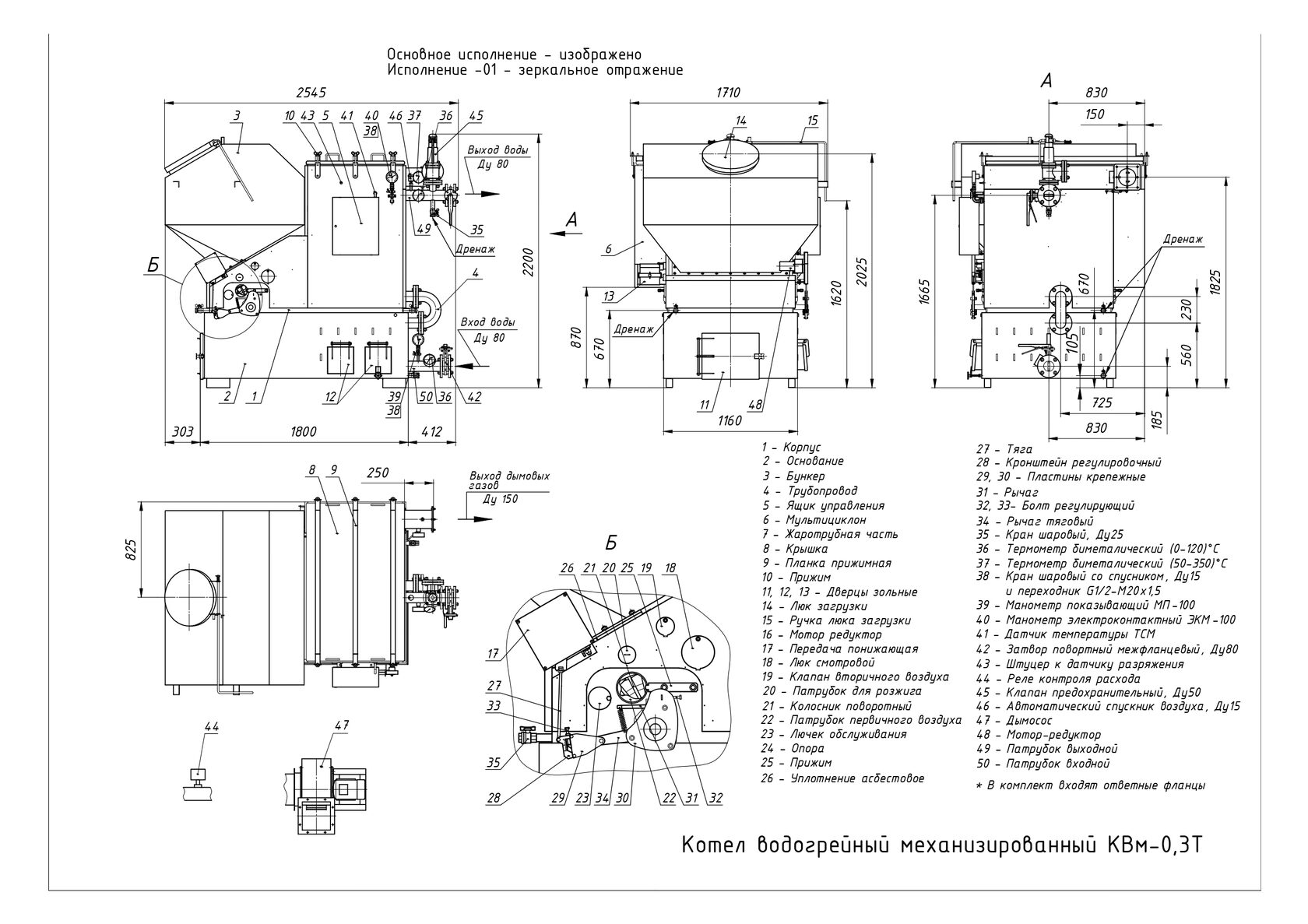 Котел водогрейный механизированный КВм-0,3T (общий вид, габ. и присоед. размеры)