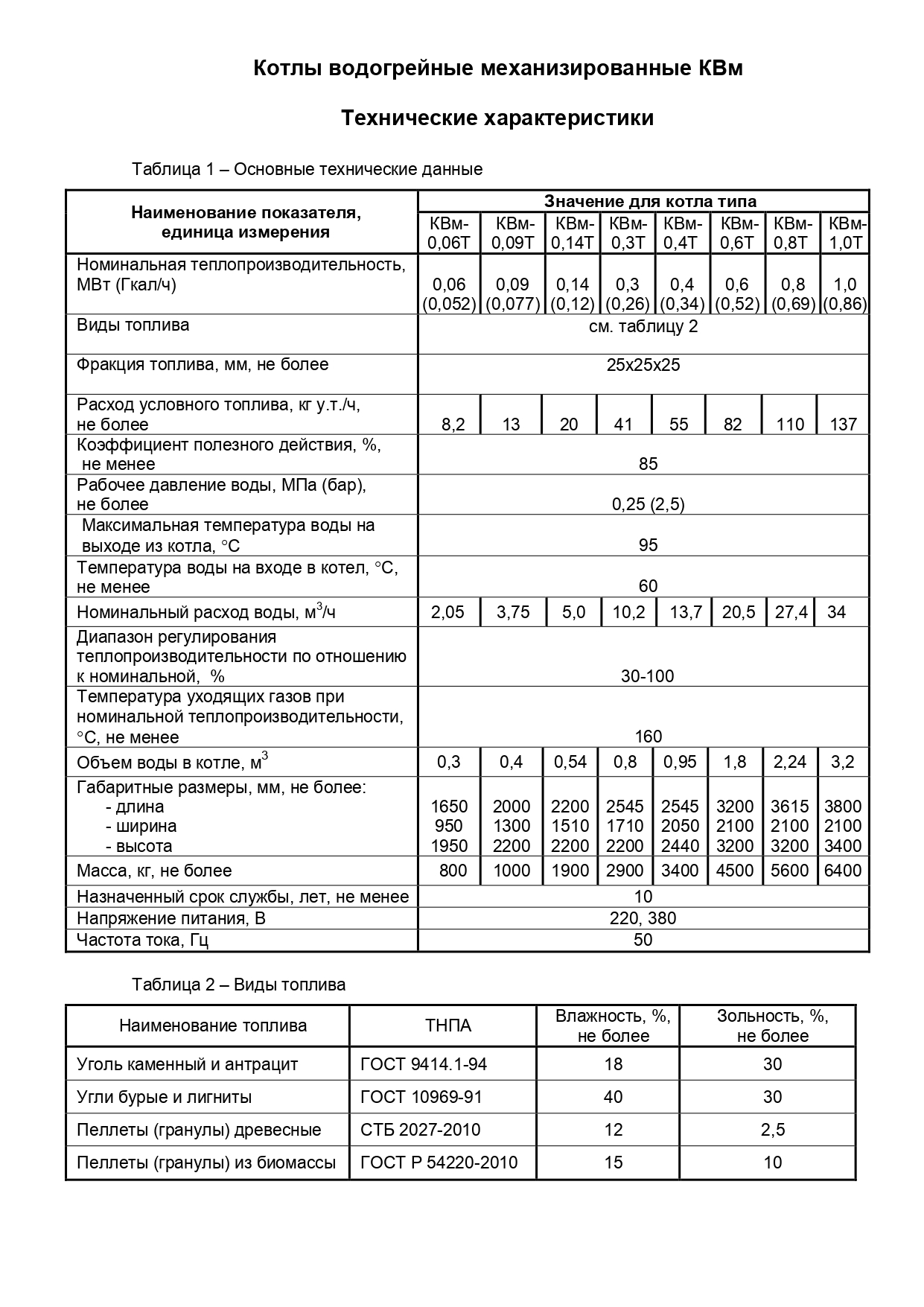 В качестве топлива должно использоваться твердое топливо, виды и параметры которого приведены в таблицах 1,2.