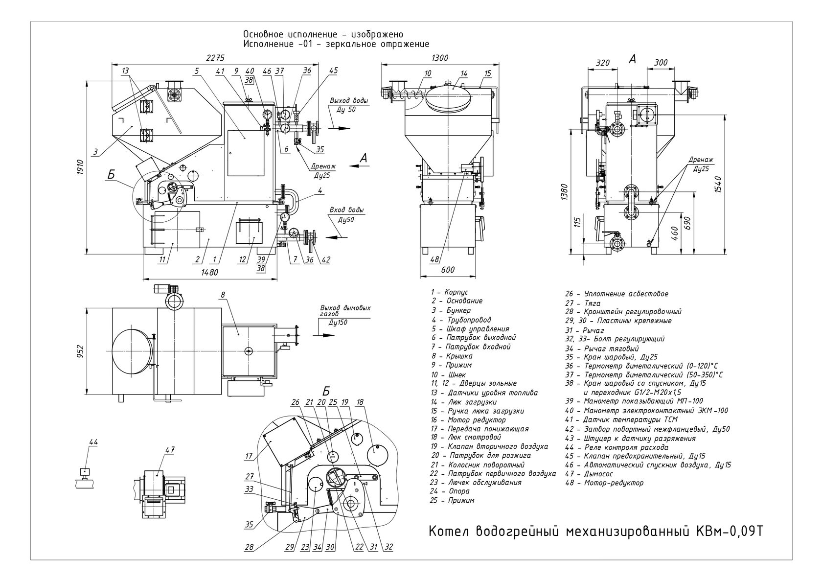 Котел водогрейный механизированный КВм-0,09T (общий вид, габ. и присоед. размеры)