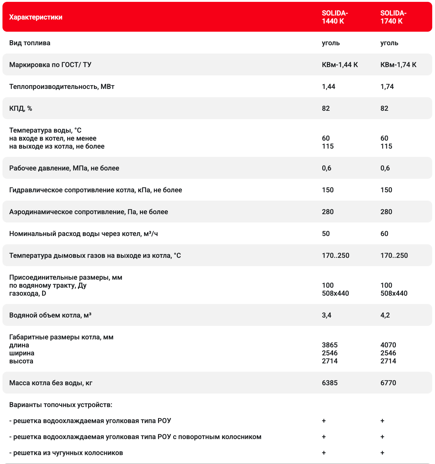 Вид топлива: каменный уголь, бурый уголь, крупные древесные отходы. Расчетный срок эксплуатации: 10 лет на каменном угле. Базовый комплект поставки: котел в легкой обмуровке, эксплуатационная документация, дополнительная комплектация (по согласованию с заказчиком).