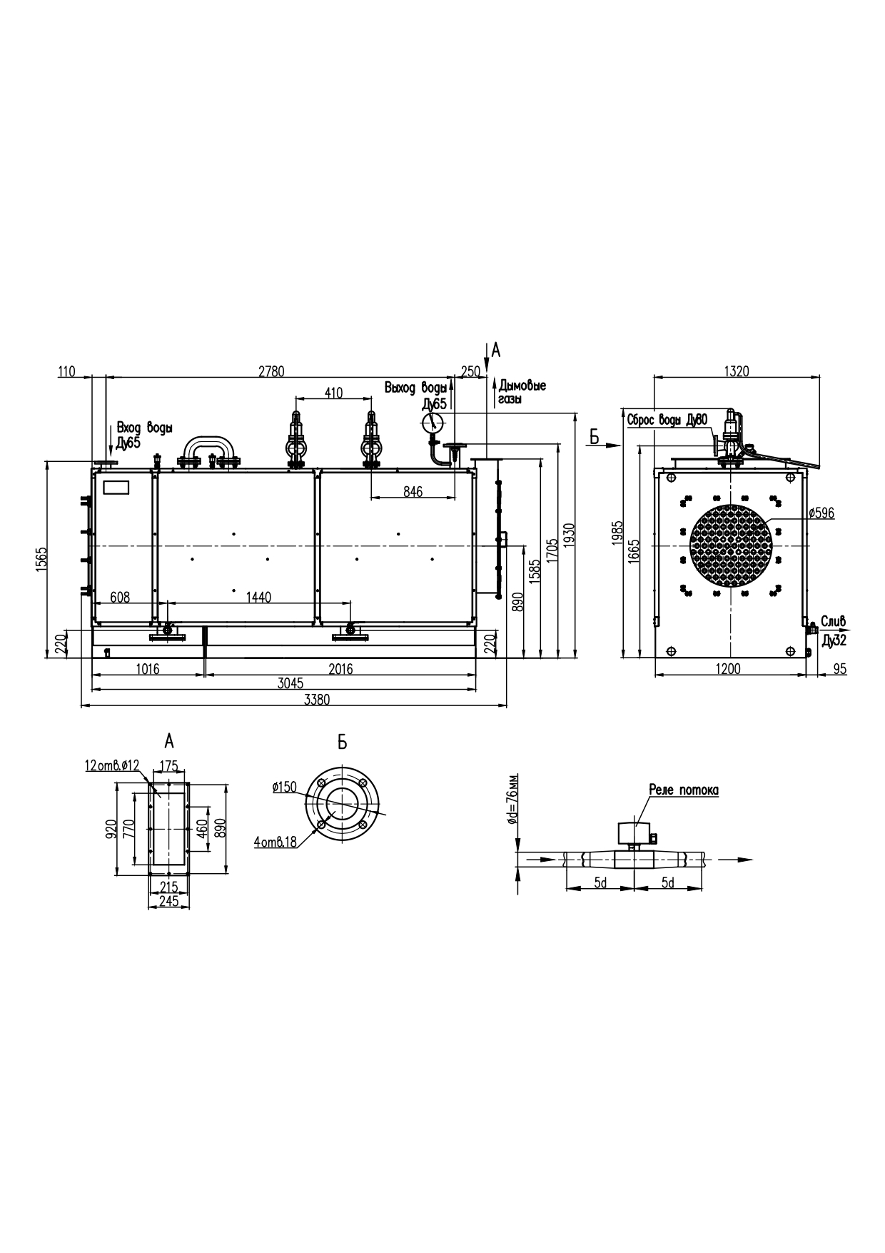 Габаритные и присоединительные размеры котла КВ-1,0Т