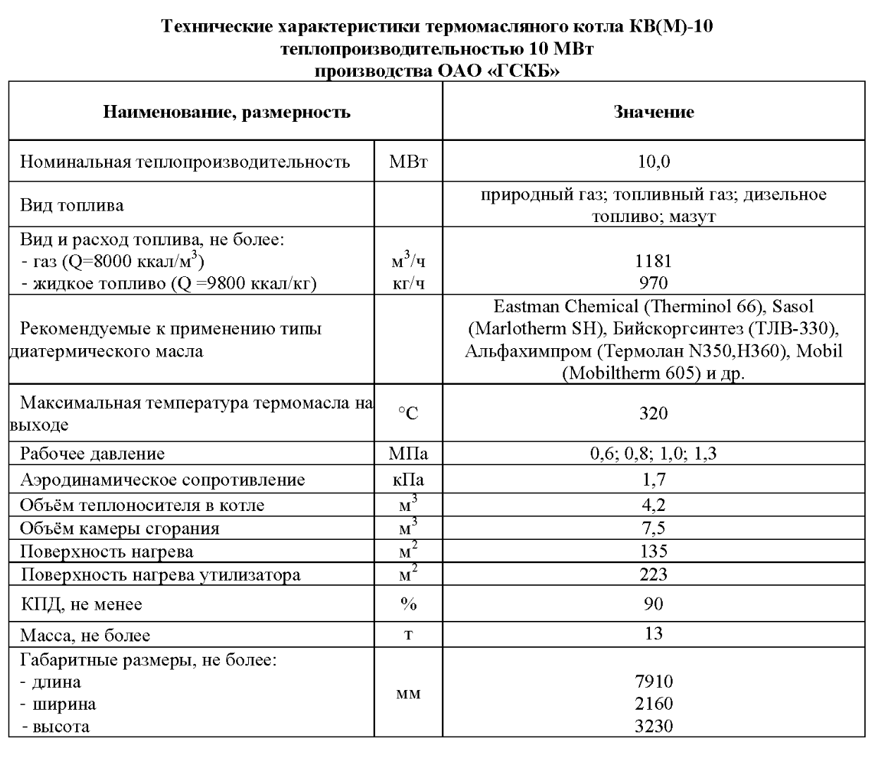 Технические характеристики термомасляного котла теплопроизводительностью 10МВт