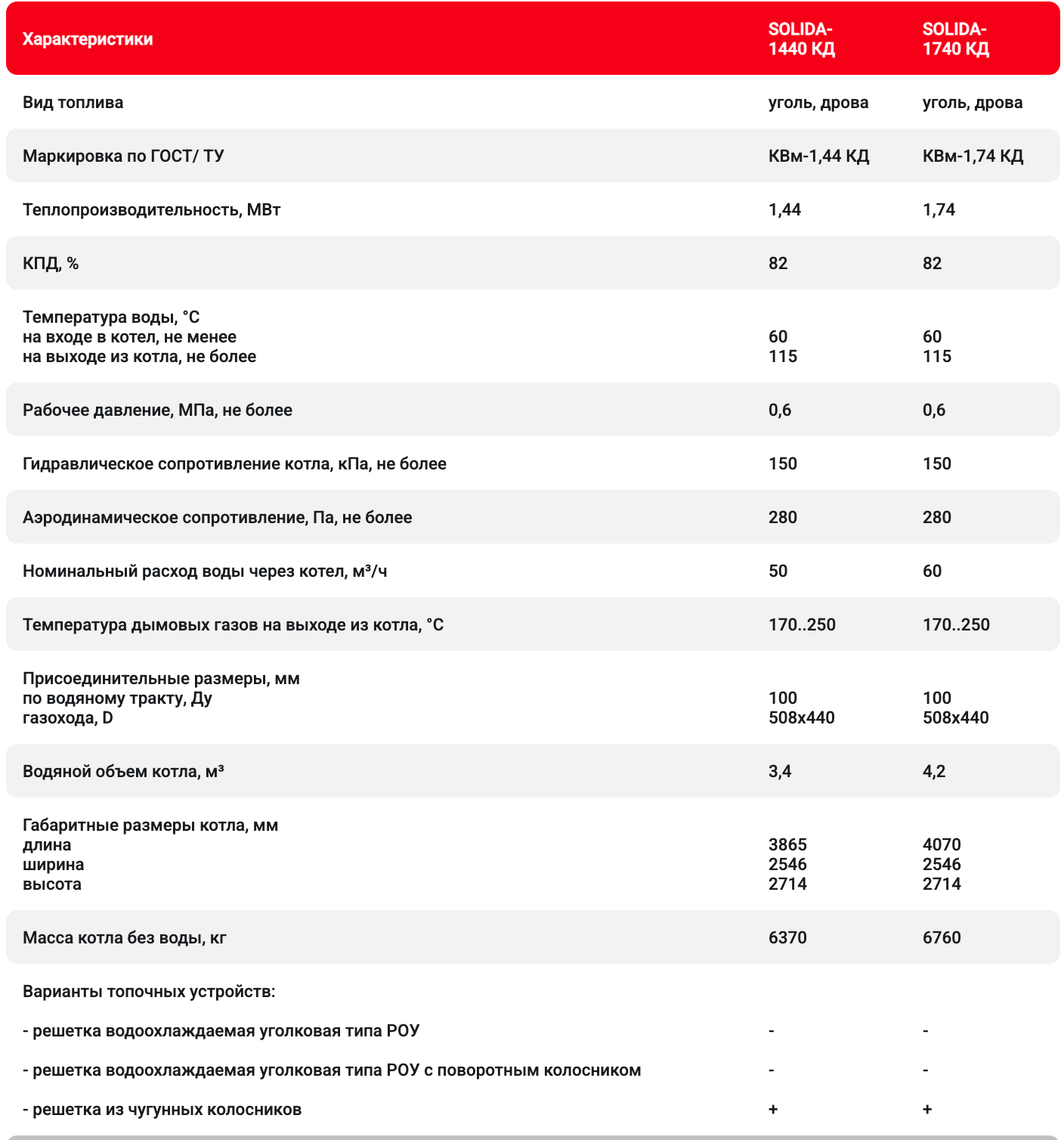 Вид топлива: каменный уголь, бурый уголь, крупные древесные отходы. Расчетный срок эксплуатации: 10 лет на каменном угле. Базовый комплект поставки: котел в легкой обмуровке, эксплуатационная документация, дополнительная комплектация (по согласованию с заказчиком).