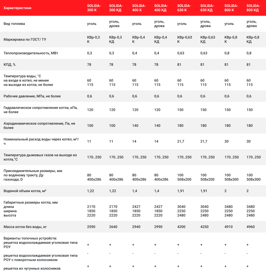 Вид топлива: каменный уголь, бурый уголь, крупные древесные отходы. Расчетный срок эксплуатации: 10 лет на каменном угле. Базовый комплект поставки: котел в легкой обмуровке, эксплуатационная документация, дополнительная комплектация (по согласованию с заказчиком).