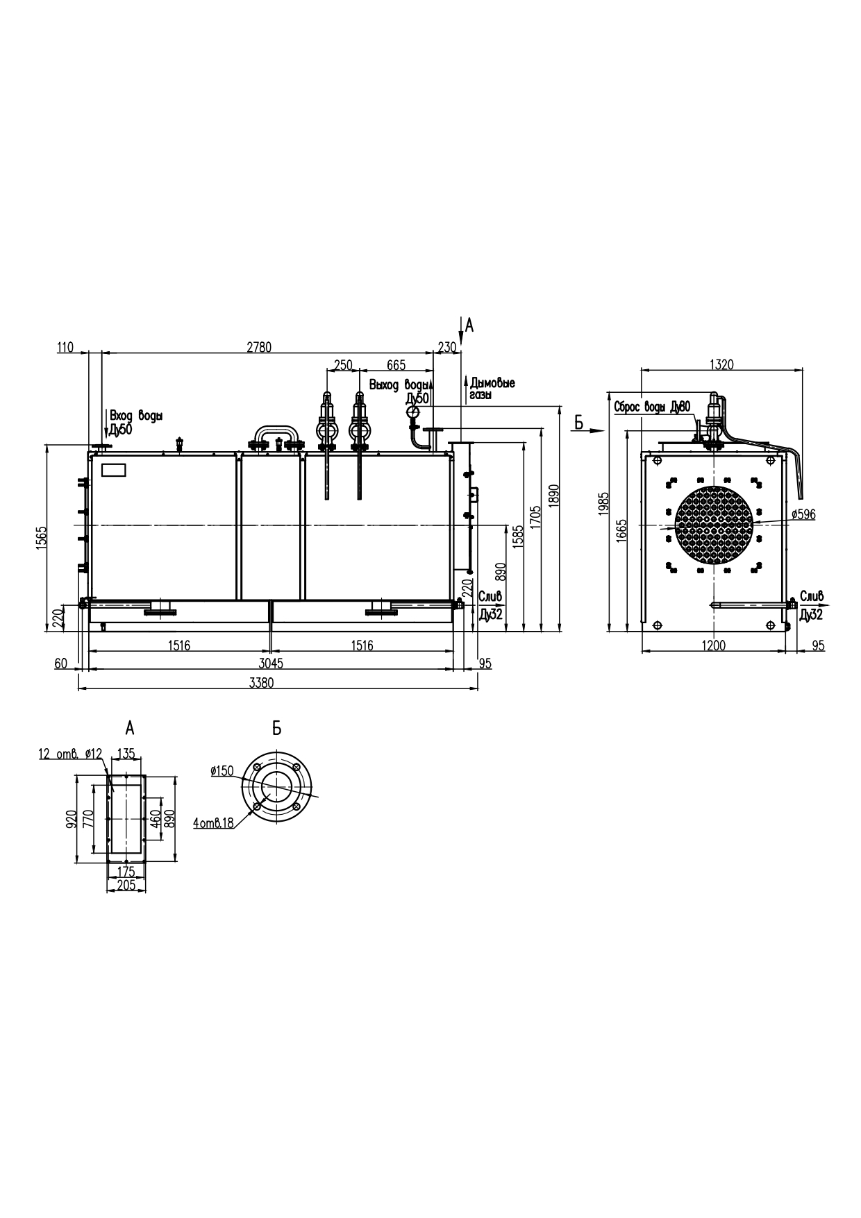 Габаритные и присоединительные размеры котла КВ-0,5Т