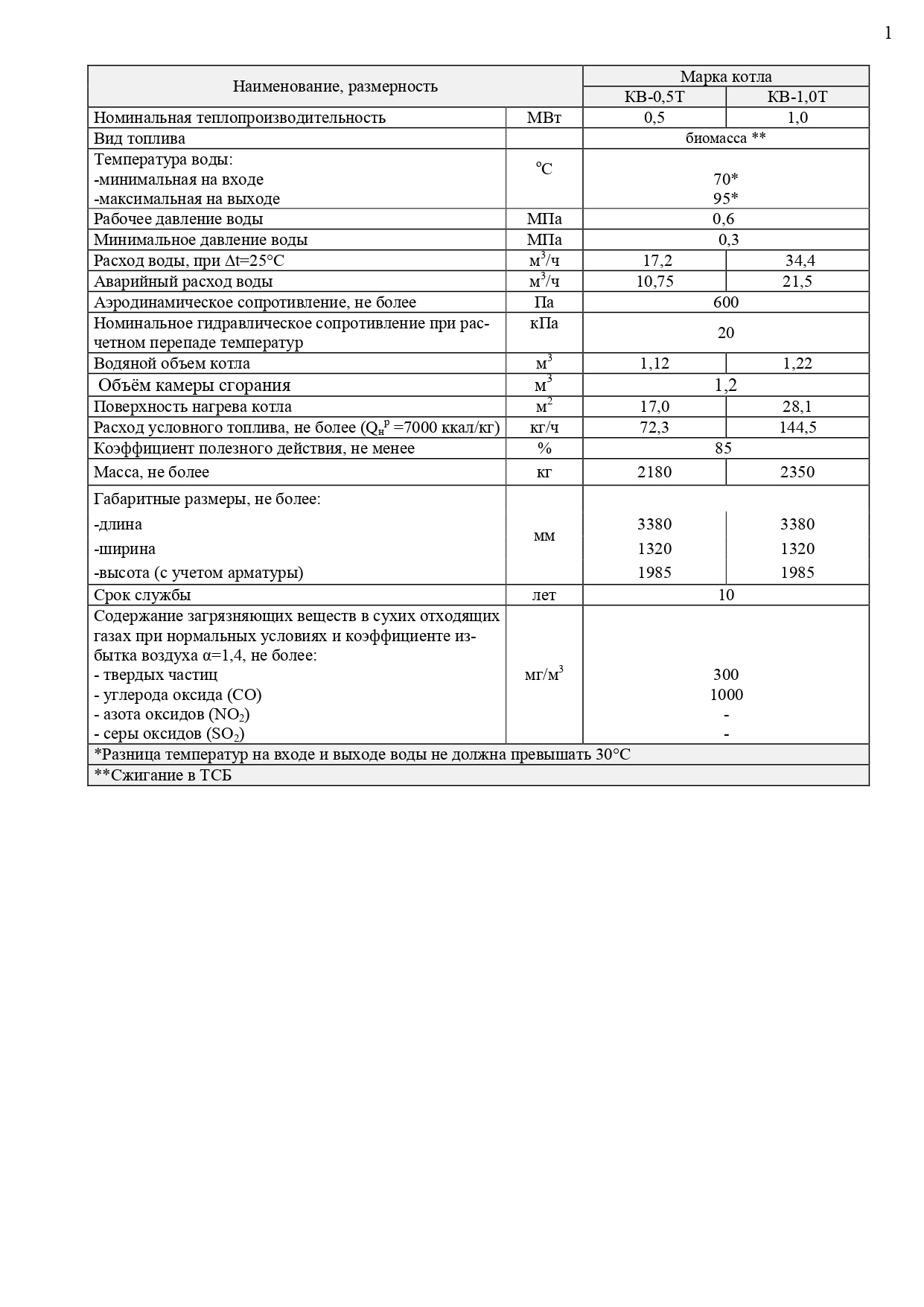 Технические характеристики КВ-0,5Т; КВ-1,0Т