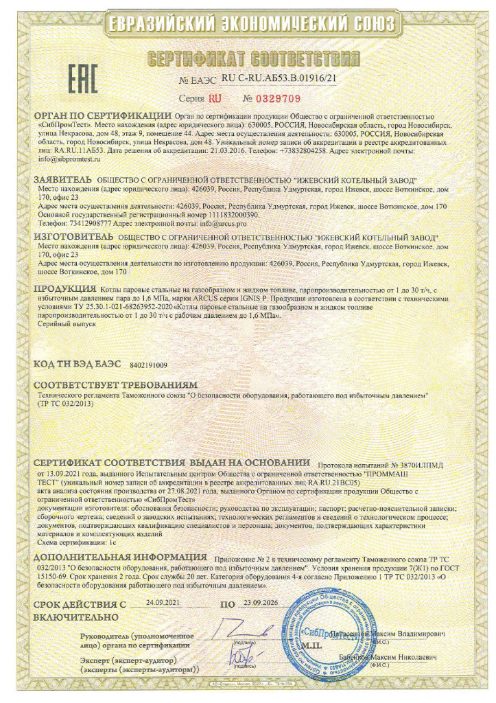 Базовый комплект поставки: котел, экономайзер, эксплуатационная документация, дополнительная комплектация (по согласованию с заказчиком).
