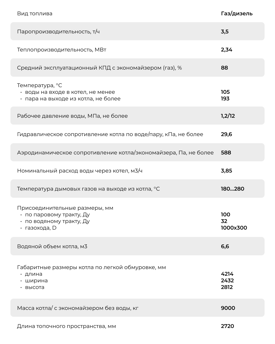 Вид топлива: природный газ ГОСТ 5542, дизельное топливо ГОСТ 305.