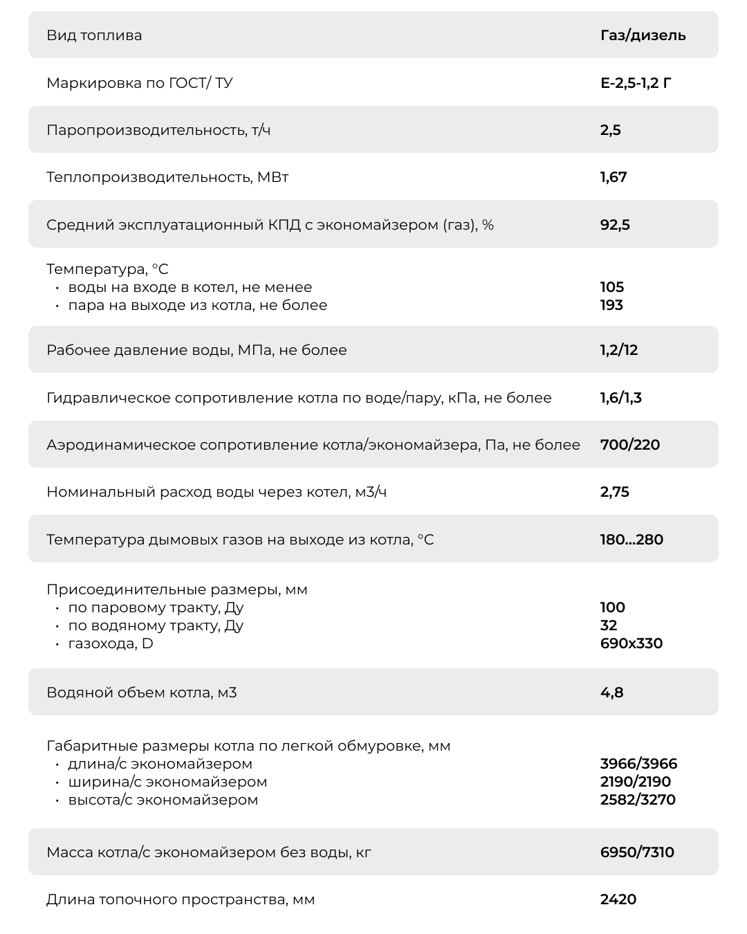 Вид топлива: природный газ ГОСТ 5542, дизельное топливо ГОСТ 305.